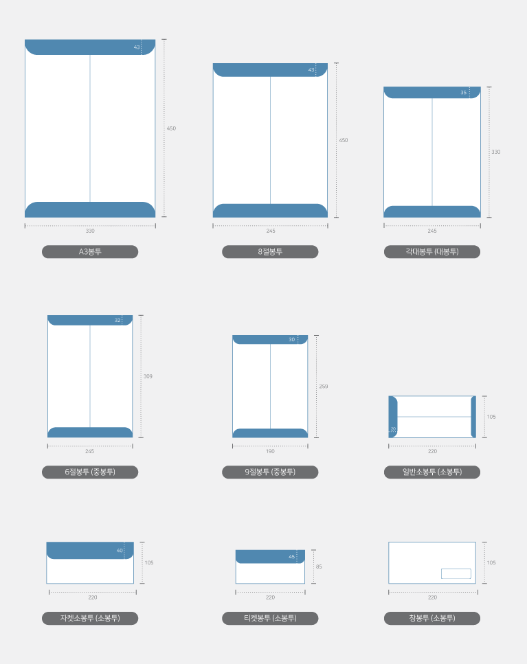 9절봉투 (작업사이즈: 406 x 314mm) / A3봉투 (작업사이즈:681 x 521mm )