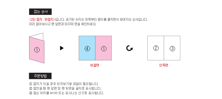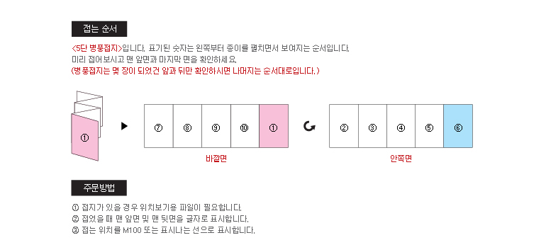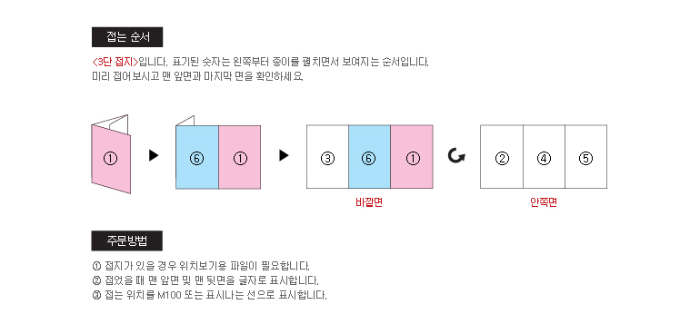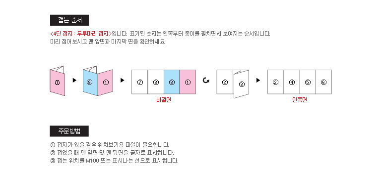 * 일반적으로 종이 두께가 180g 이상의 종이로 제작하실 경우에는 접힌 뒷면에 터짐 현상으로 인하여인쇄물이 손상 되어 보일 수 있습니다.