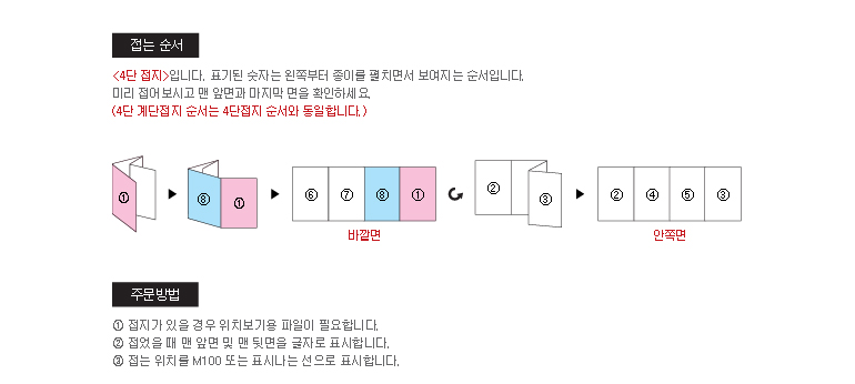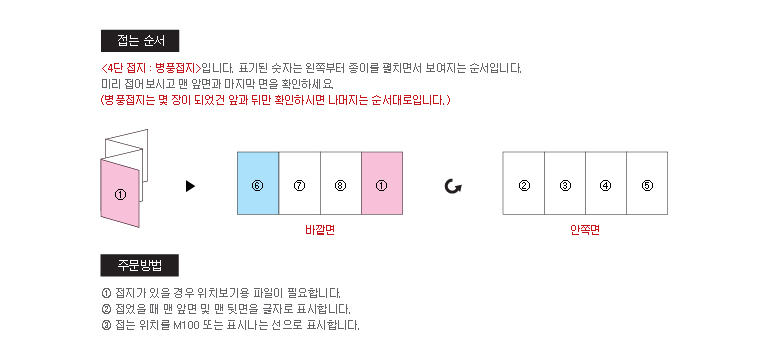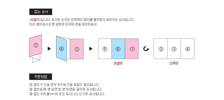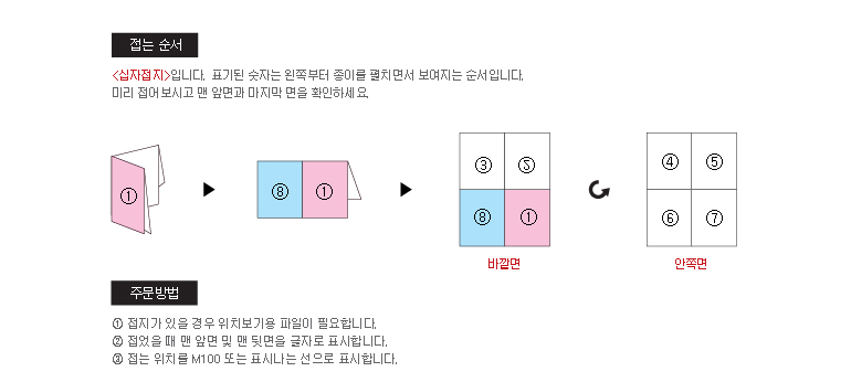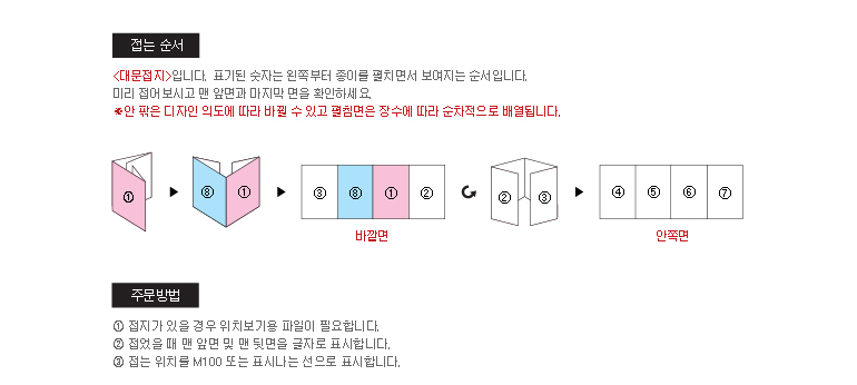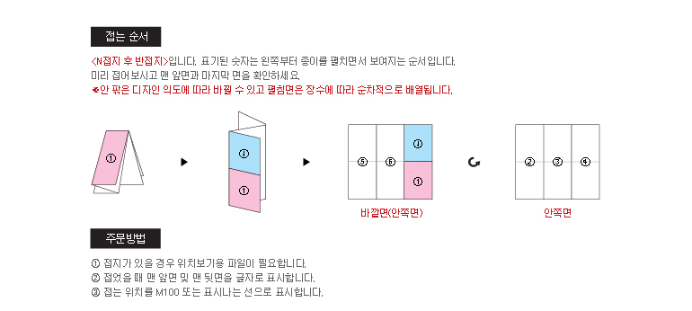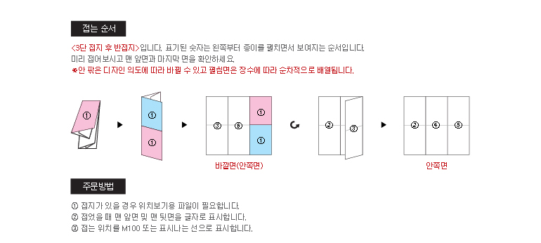 * 디자인하시는 시각에 따라 페이지가 달라질 수 있으므로 디자인 완료 후 바깥 면과 안쪽 면이 맞는지접어서 확인하신 다음 접수해 주시기 바랍니다.