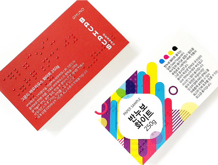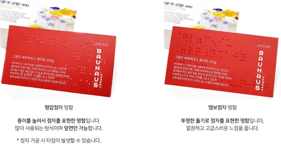 점자 후가공이 추가된 명함으로 엠보와 형압 두가지 로 표현 가능합니다.