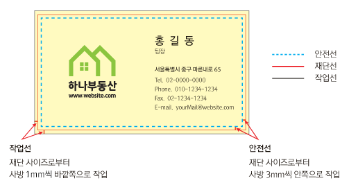 92 X 52mm 명함일 때 실제 파일도 92 X 52mm로 작업되어 있어야 하며, 세로명함일 경우 앞면은 90도 회전,