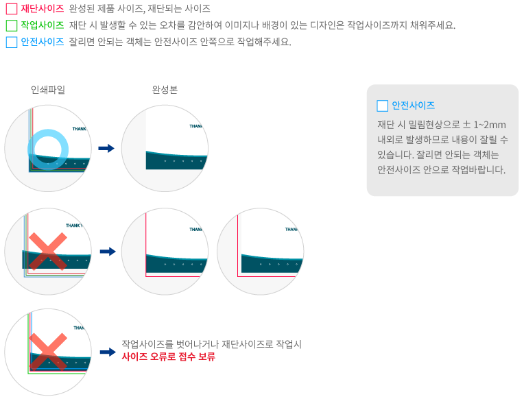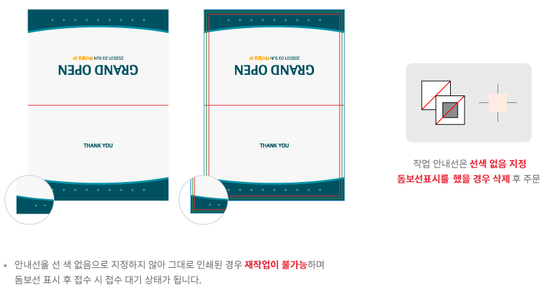 · 파일 업로드 시 돔보선은 넣지 마시고 안전선 / 재단선 / 작업선은 삭제가아닌 꼭 안 보이는 선색 없음으로 설정하셔야 합니다.